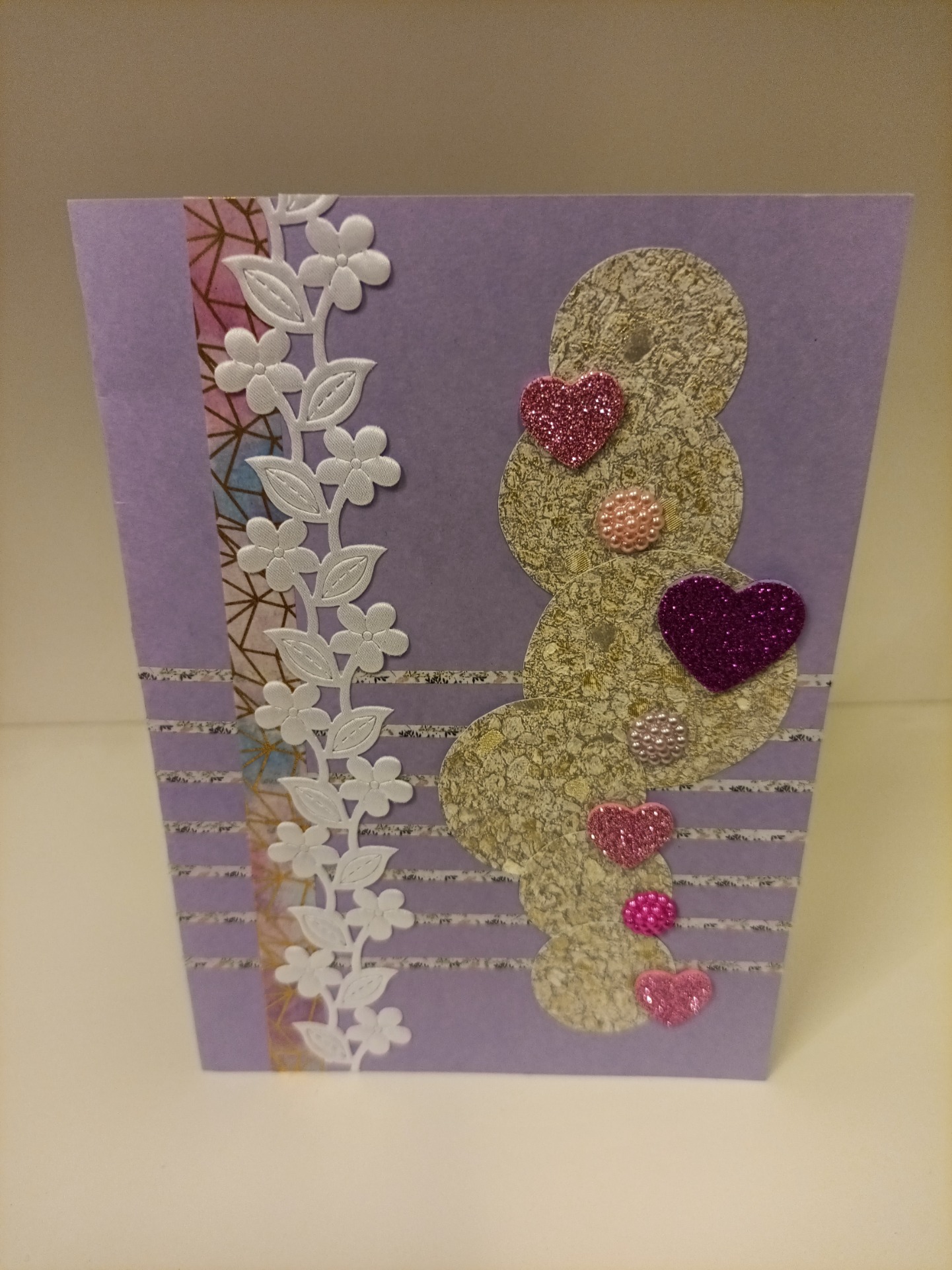 Kort, dobbel, laget av tapet-, scrapbook- og gjenbruksmateriale. 20x15 cm (A5). Konvolutt følger med.