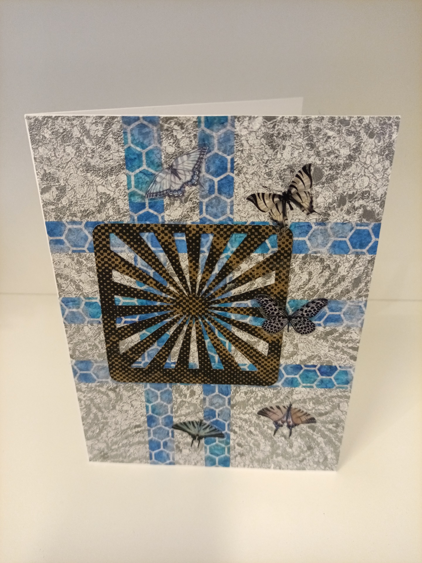 Kort, dobbel, laget av tapet-, scrapbook- og gjenbruksmateriale. 20x15 cm (A5). Konvolutt følger med.