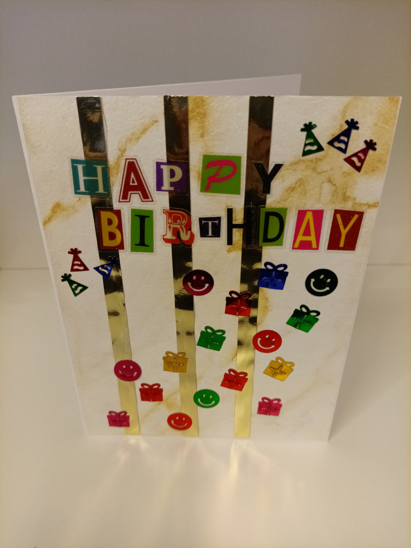 Kort, dobbel, laget av tapet-, scrapbook- og gjenbruksmateriale. 20x15 cm (A5). Konvolutt følger med.