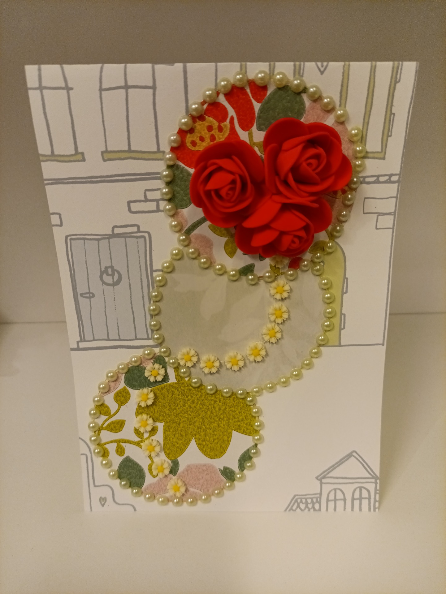 Kort, dobbel, laget av tapet-, scrapbook- og gjenbruksmateriale. 20x15 cm (A5). Konvolutt følger med.