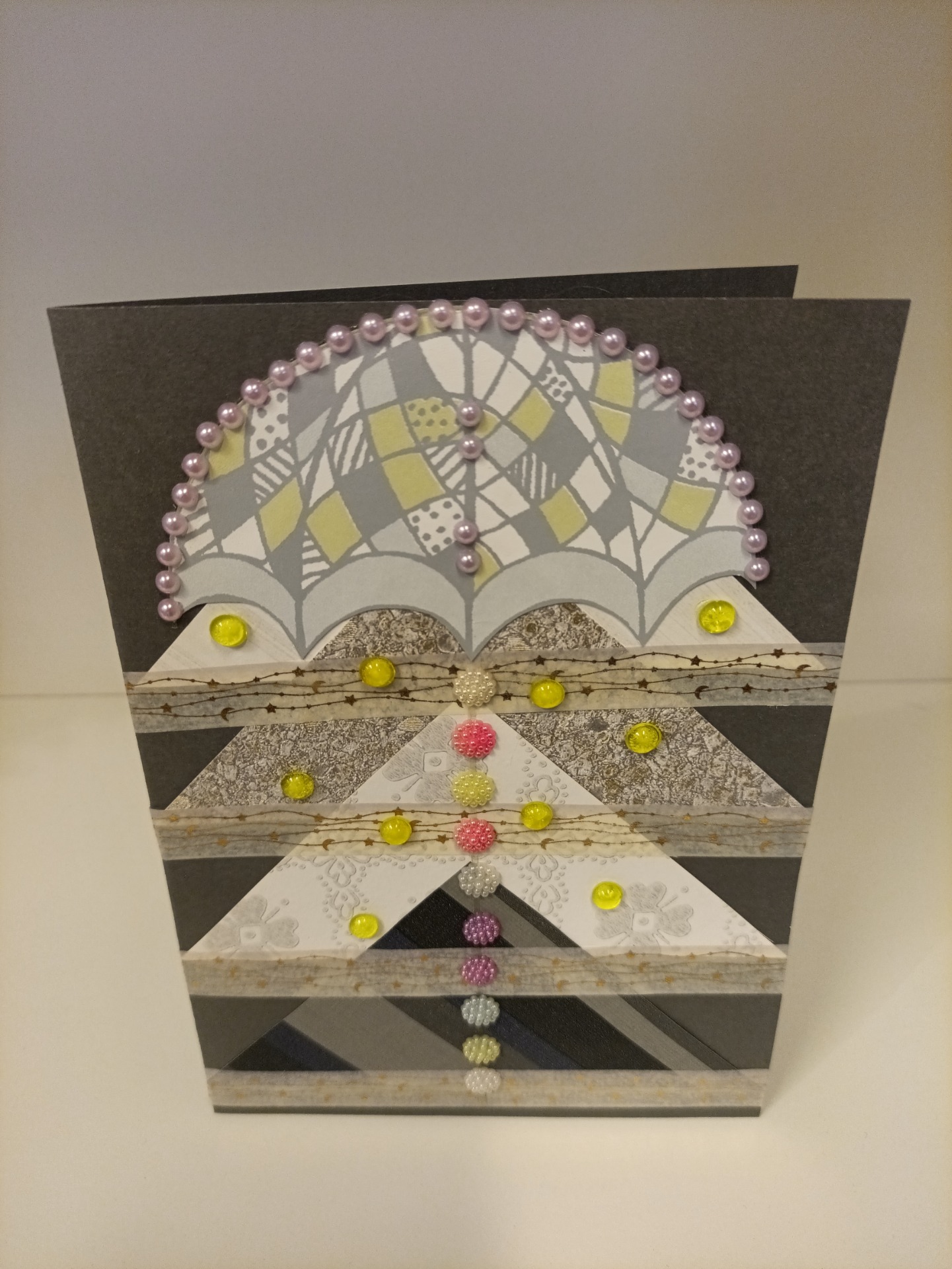 Kort, dobbel, laget av tapet-, scrapbook- og gjenbruksmateriale. 20x15 cm (A5). Konvolutt følger med.