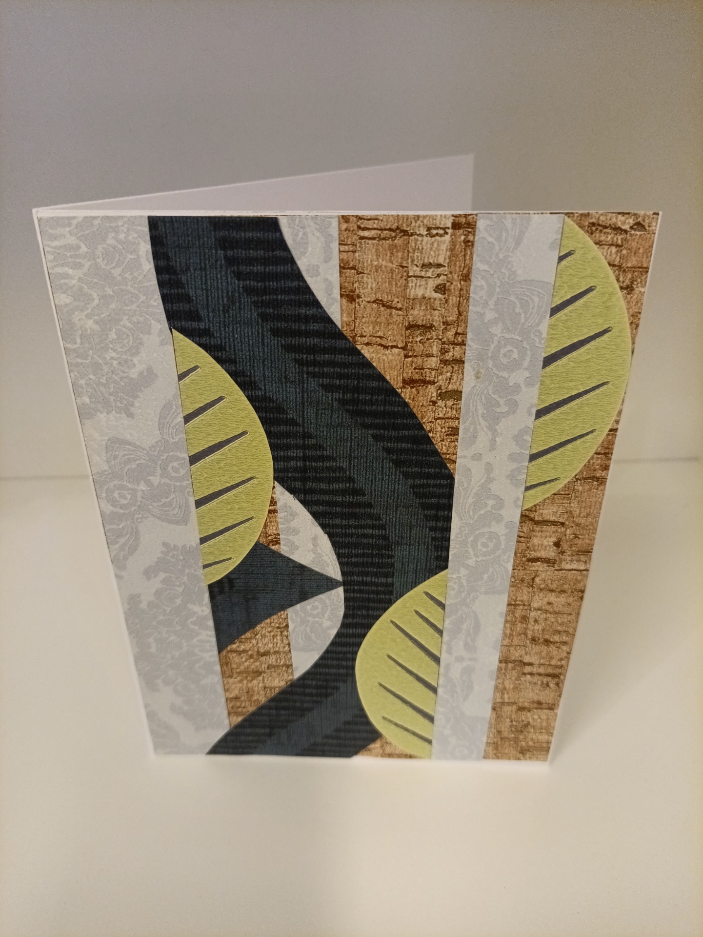 Kort, dobbel, laget av tapet-, scrapbook- og gjenbruksmateriale. 20x15 cm (A5). Konvolutt følger med.