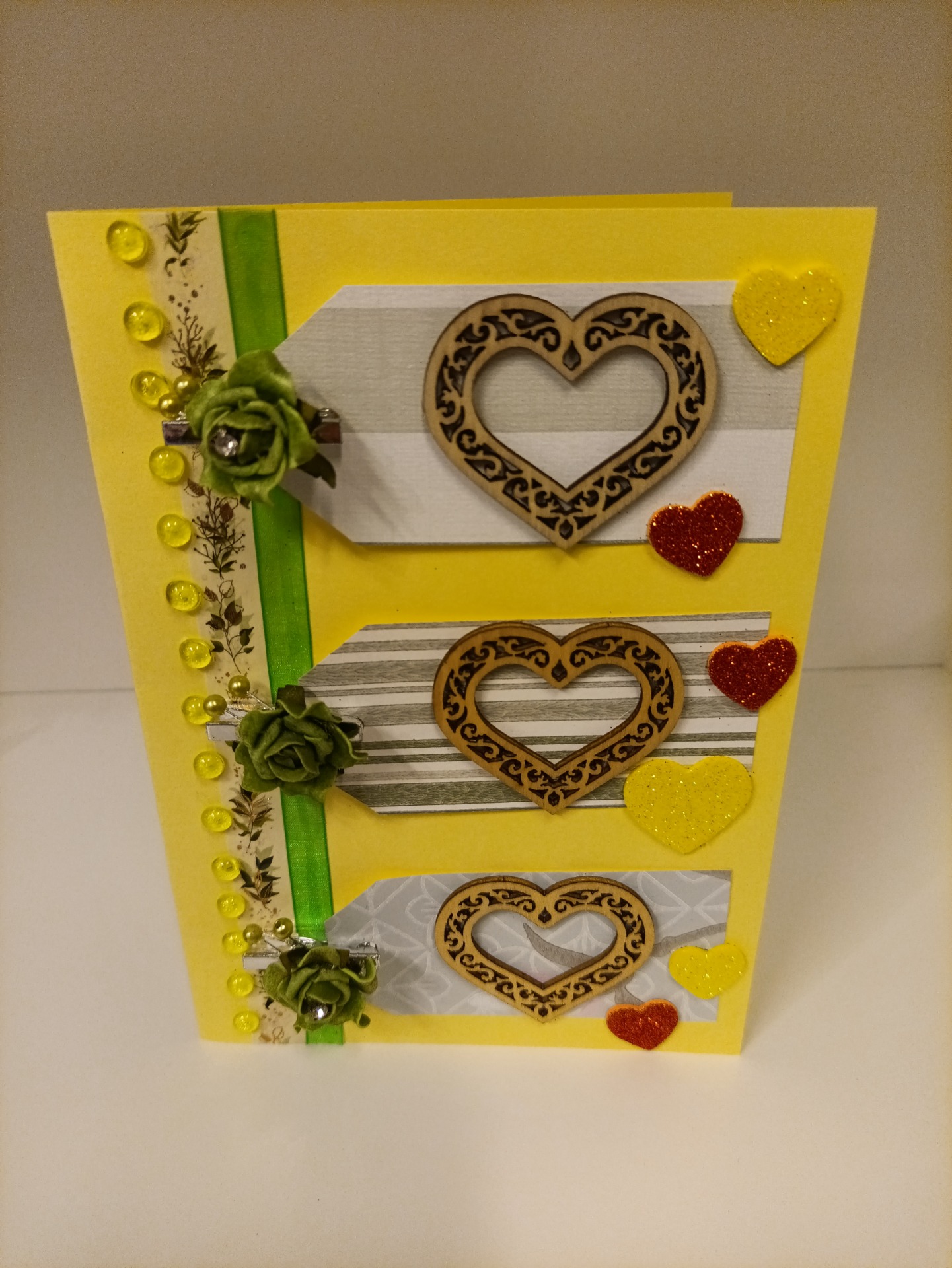Kort, dobbel, laget av tapet-, scrapbook- og gjenbruksmateriale. 20x15 cm (A5). Konvolutt følger med.
