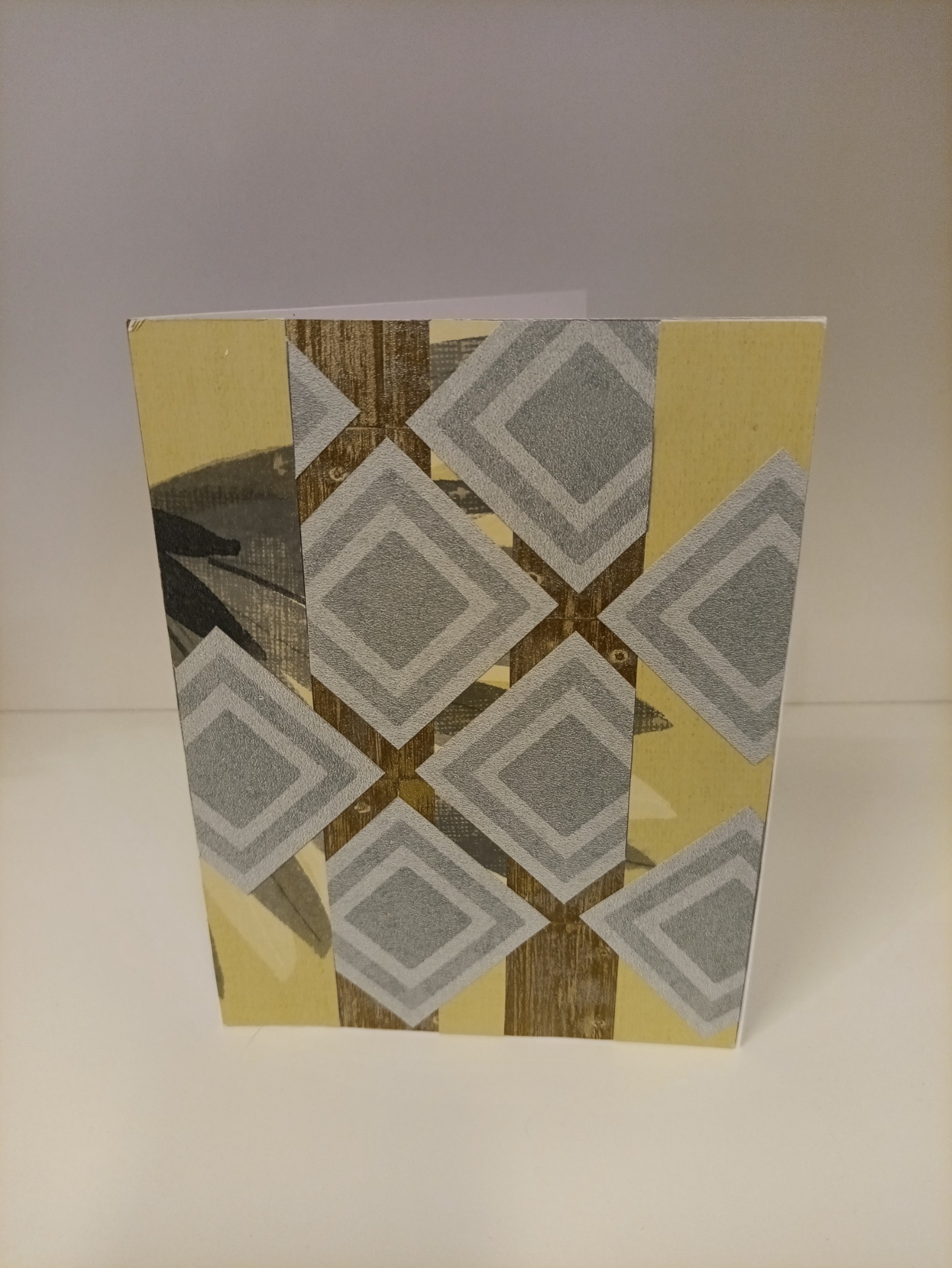 Kort, dobbel, laget av tapet-, scrapbook- og gjenbruksmateriale. 20x15 cm (A5). Konvolutt følger med.