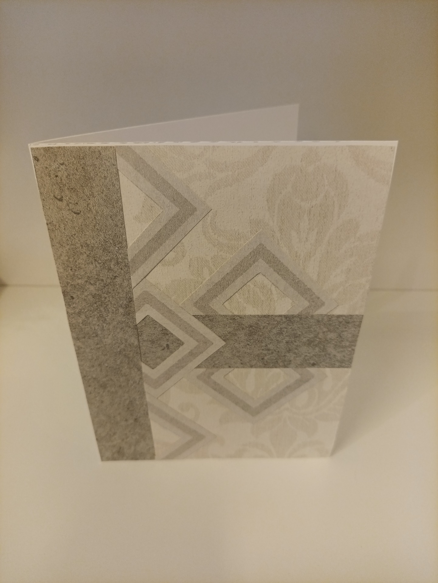 Kort, dobbel, laget av tapet-, scrapbook- og gjenbruksmateriale. 20x15 cm (A5). Konvolutt følger med.