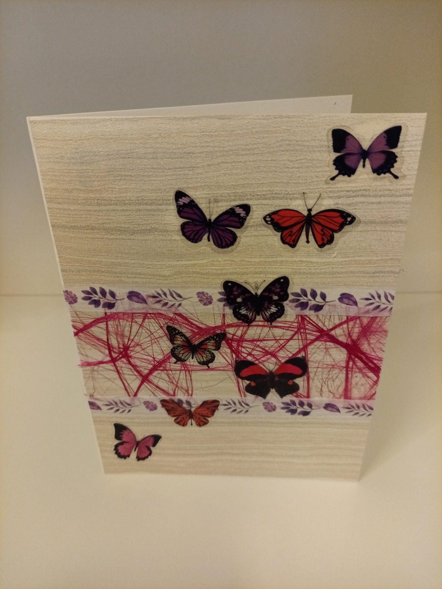 Kort, dobbel, laget av tapet-, scrapbook- og gjenbruksmateriale. 20x15 cm (A5). Konvolutt følger med.