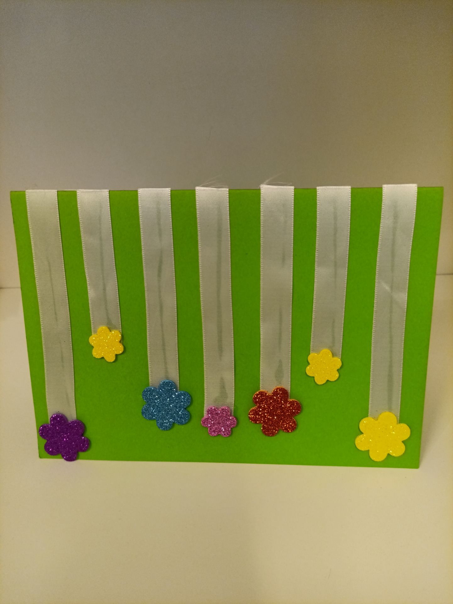 Kort, dobbel, laget av tapet-, scrapbook- og gjenbruksmateriale. 20x15 cm (A5). Konvolutt følger med.