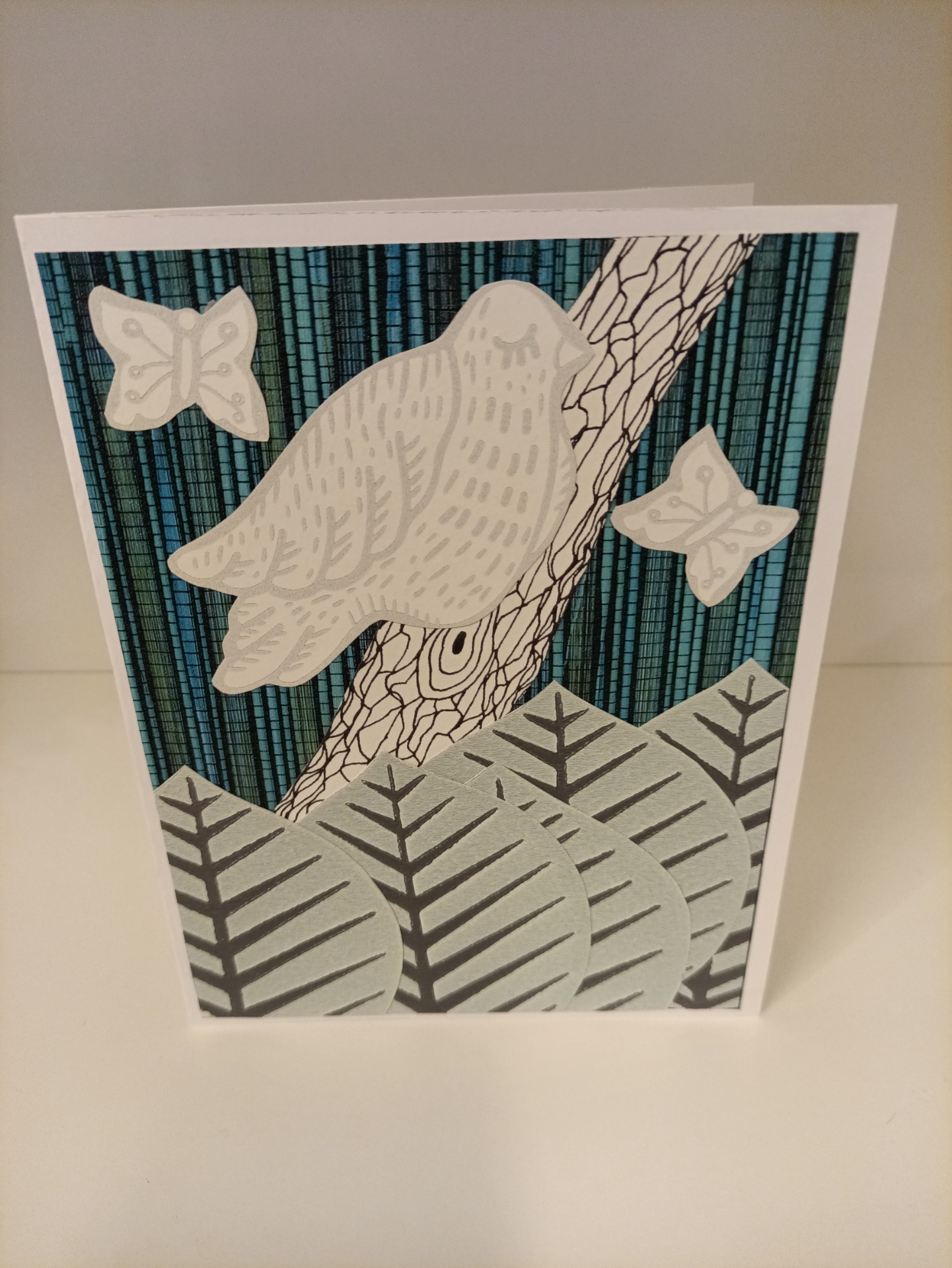 Kort, dobbel, laget av tapet-, scrapbook- og gjenbruksmateriale. 20x15 cm (A5). Konvolutt følger med.