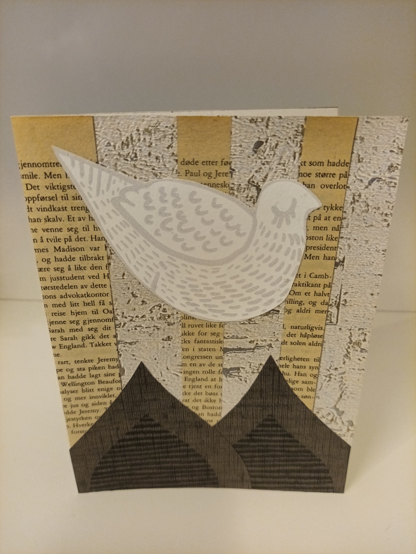 Kort, dobbel, laget av tapet-, scrapbook- og gjenbruksmateriale. 20x15 cm (A5). Konvolutt følger med.