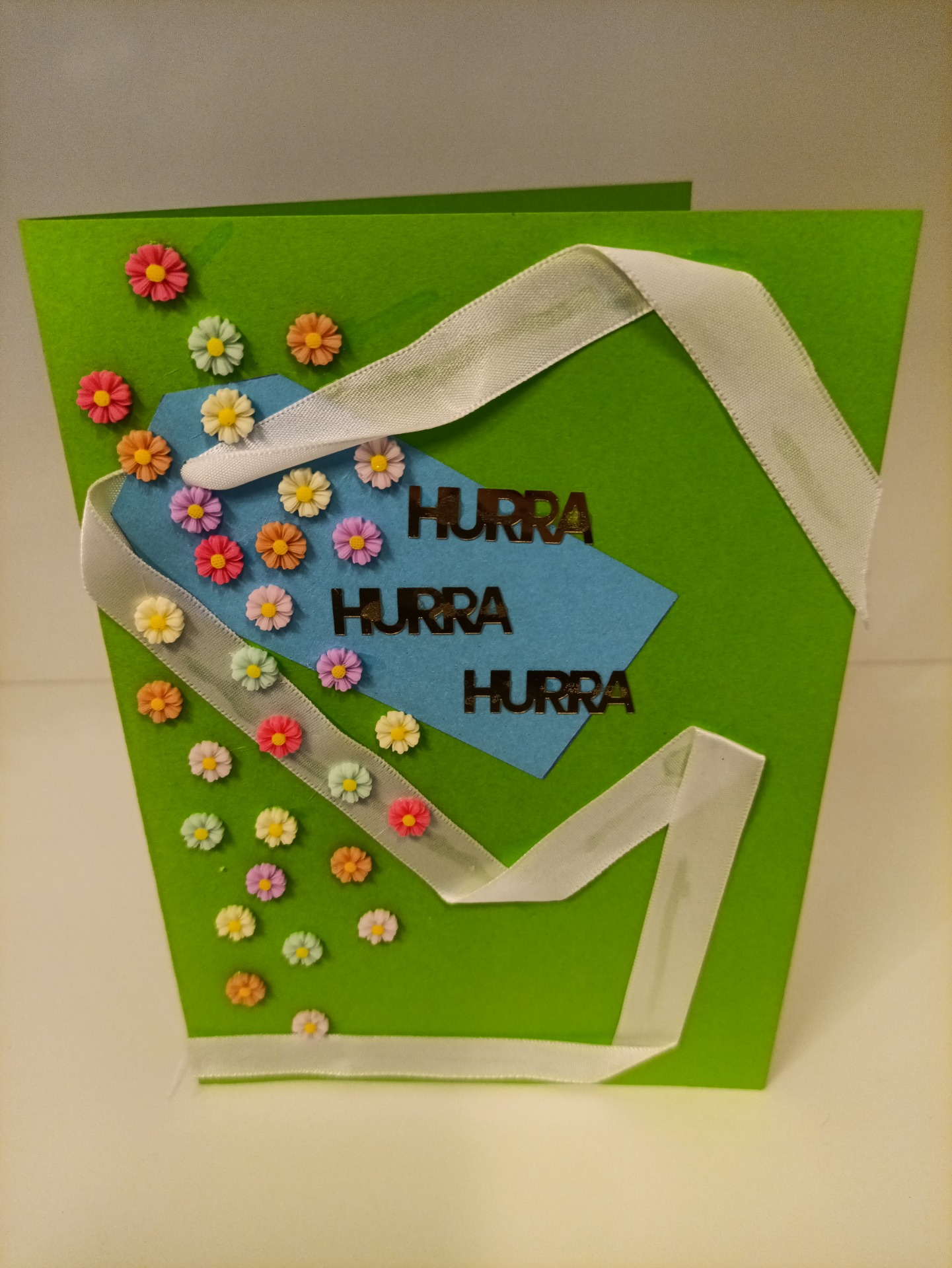 Kort, dobbel, laget av tapet-, scrapbook- og gjenbruksmateriale. 20x15 cm (A5). Konvolutt følger med.