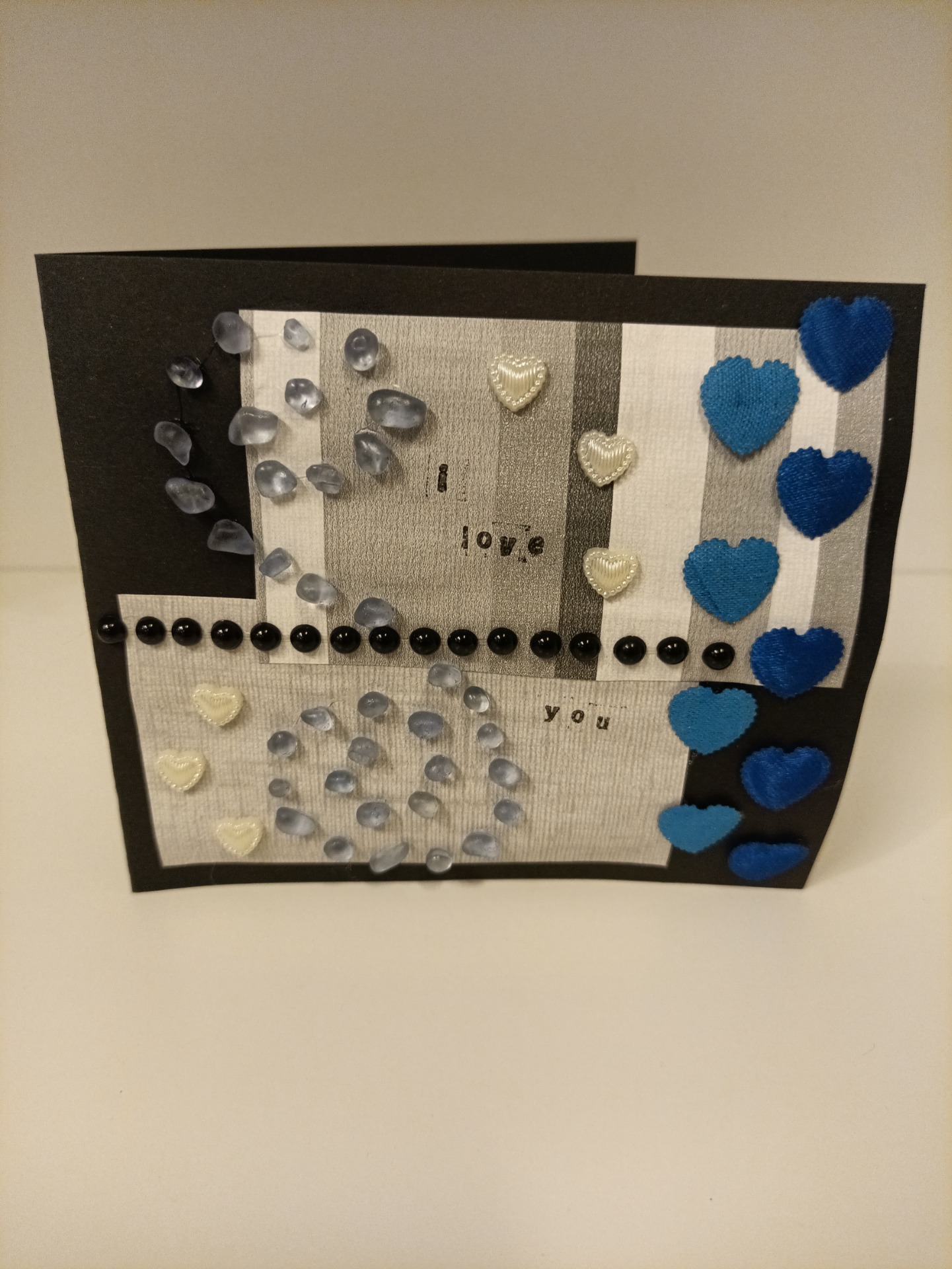 Kort, dobbel, laget av tapet-, scrapbook- og gjenbruksmateriale. 15x13 cm. Konvolutt følger med.