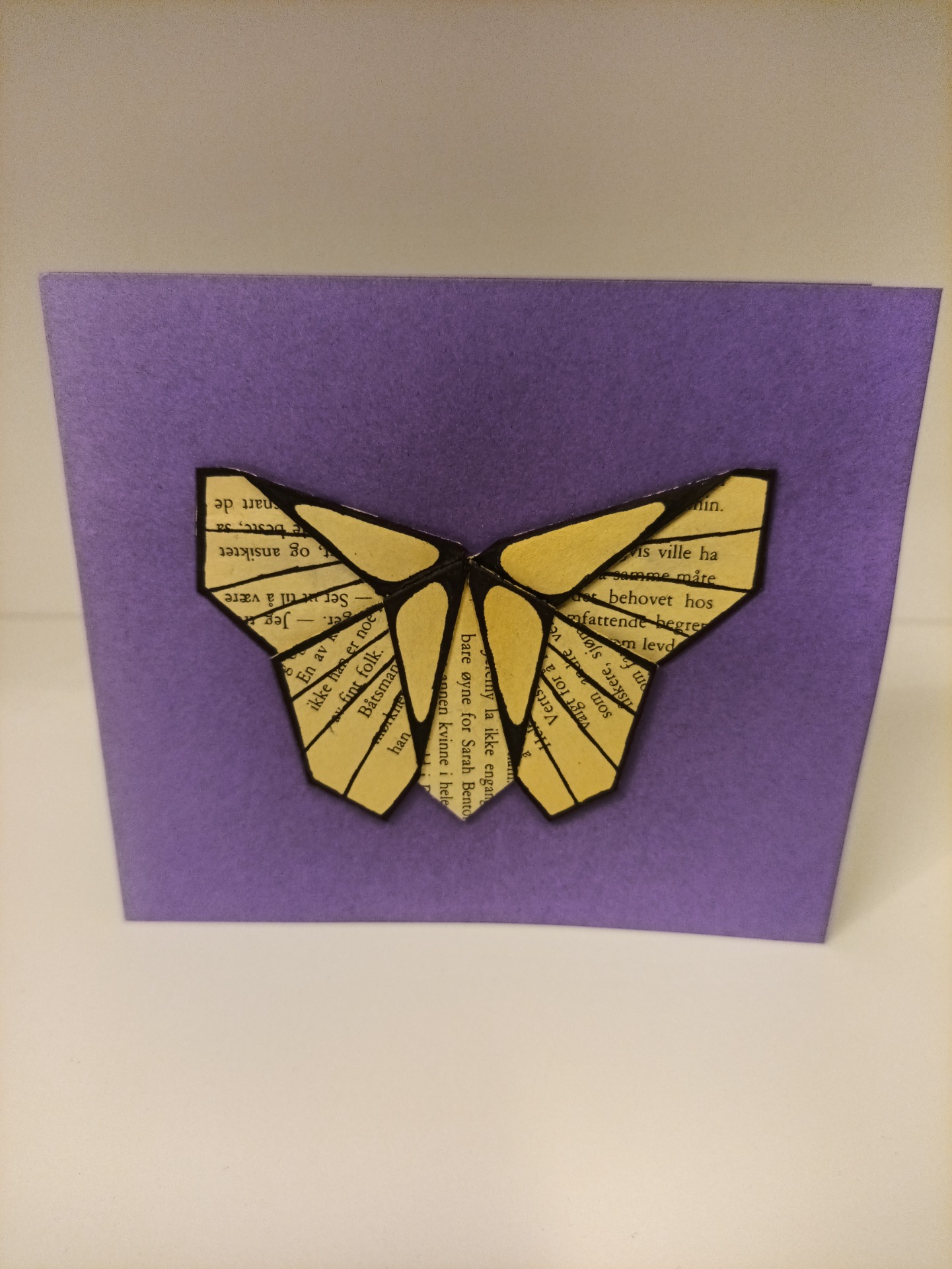 Kort, dobbel, laget av tapet-, scrapbook- og gjenbruksmateriale. 15x13 cm. Konvolutt følger med.