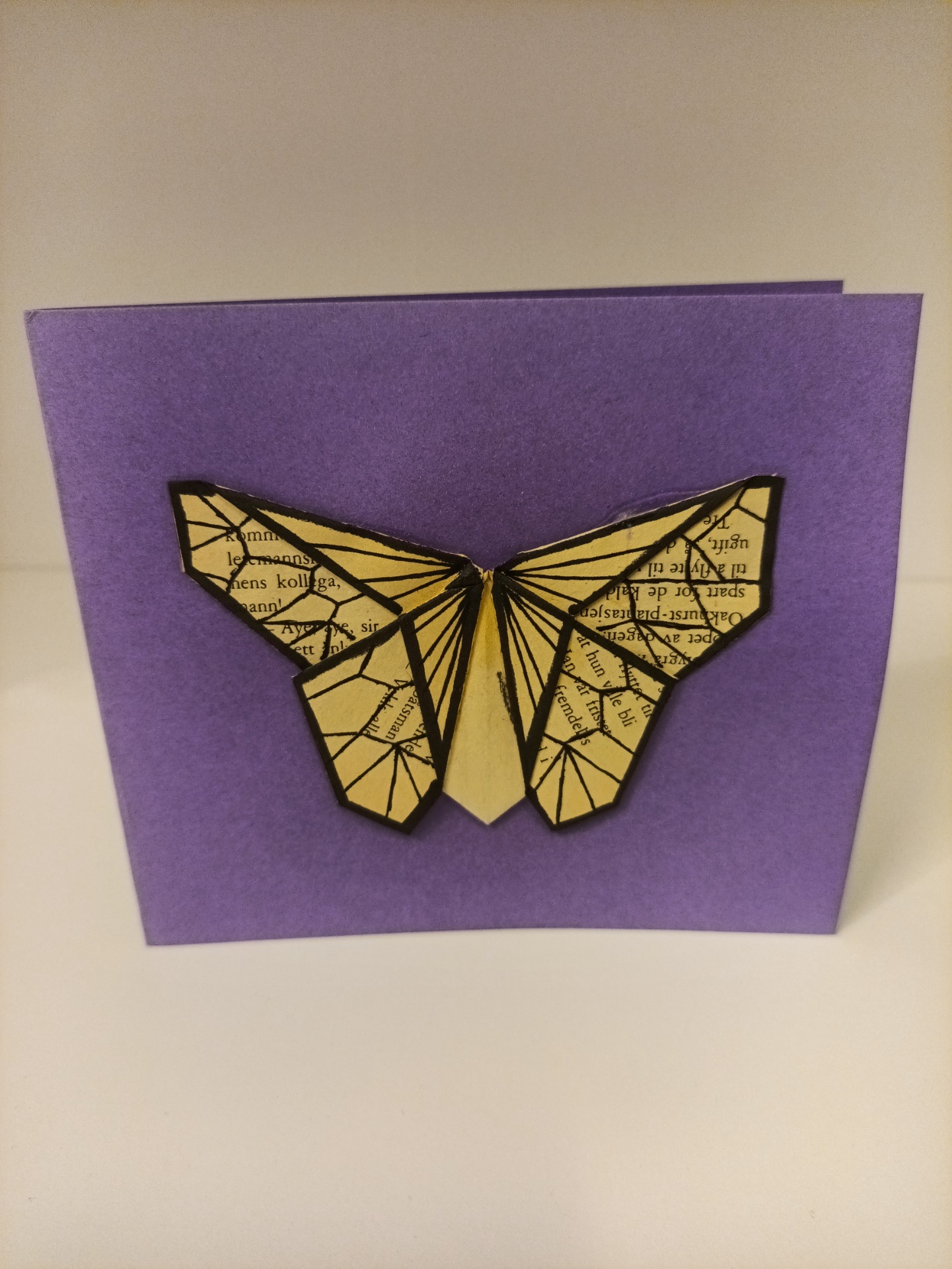 Kort, dobbel, laget av tapet-, scrapbook- og gjenbruksmateriale. 15x13 cm. Konvolutt følger med.