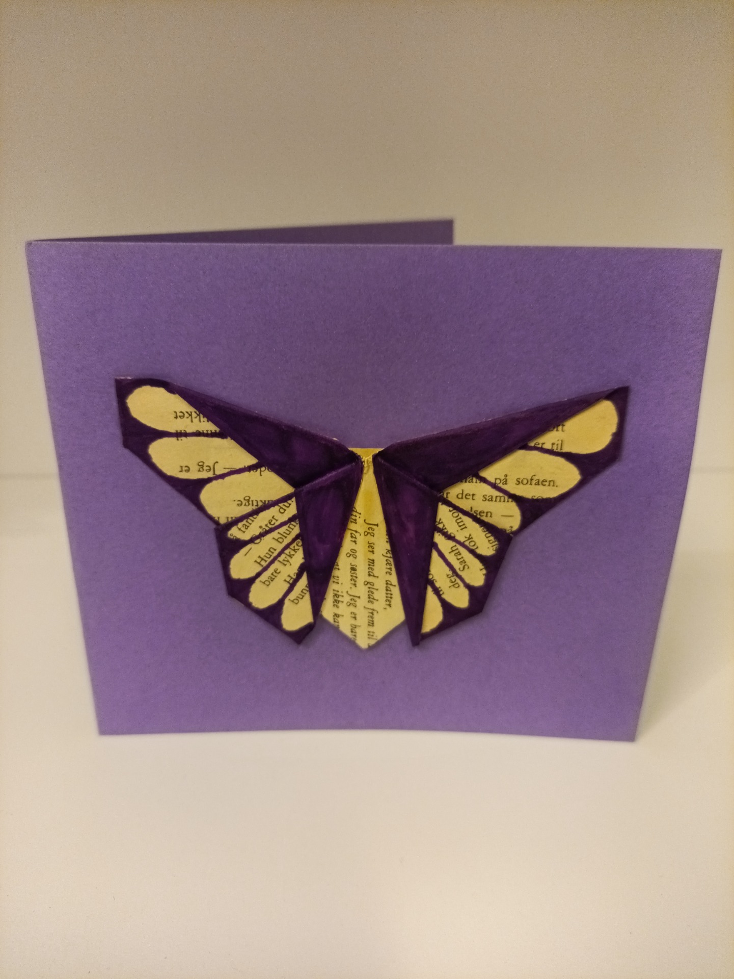 Kort, dobbel, laget av tapet-, scrapbook- og gjenbruksmateriale. 15x13 cm. Konvolutt følger med.