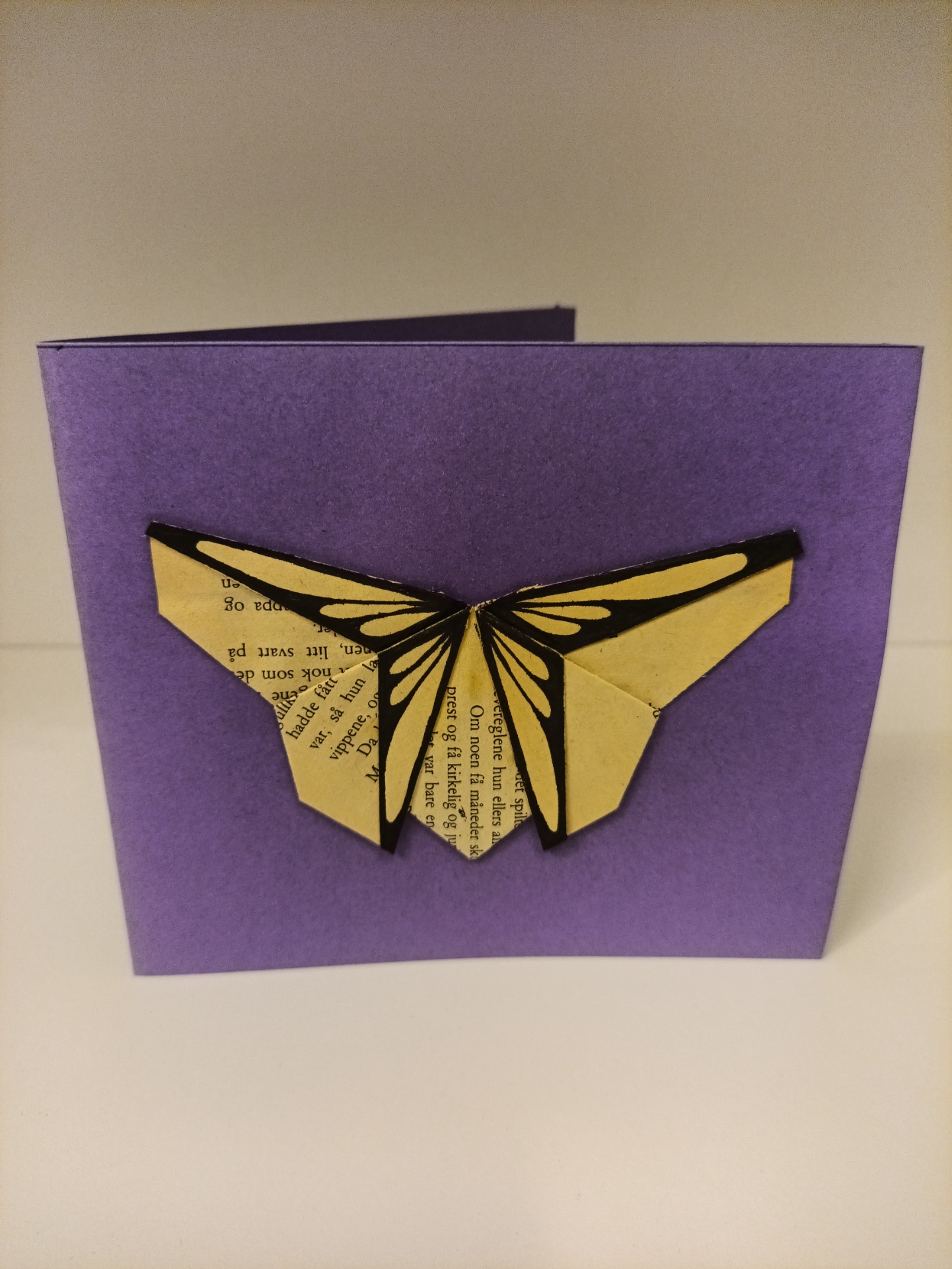 Kort, dobbel, laget av tapet-, scrapbook- og gjenbruksmateriale. 15x13 cm. Konvolutt følger med.