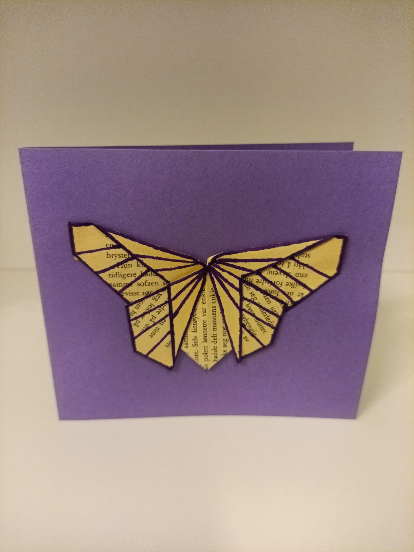 Kort, dobbel, laget av tapet-, scrapbook- og gjenbruksmateriale. 15x13 cm. Konvolutt følger med.