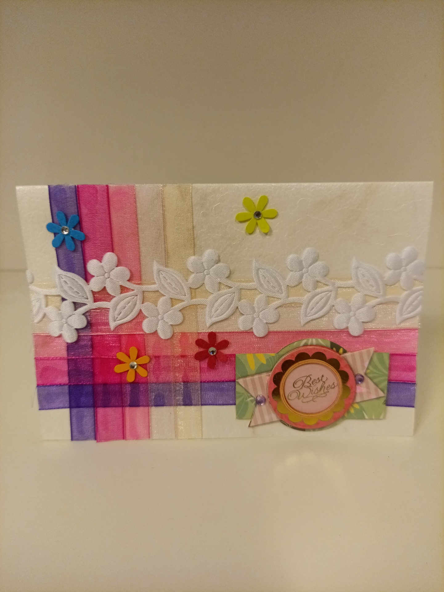 Kort, dobbel, laget av tapet-, scrapbook- og gjenbruksmateriale. 15x10 cm. Konvolutt følger med.