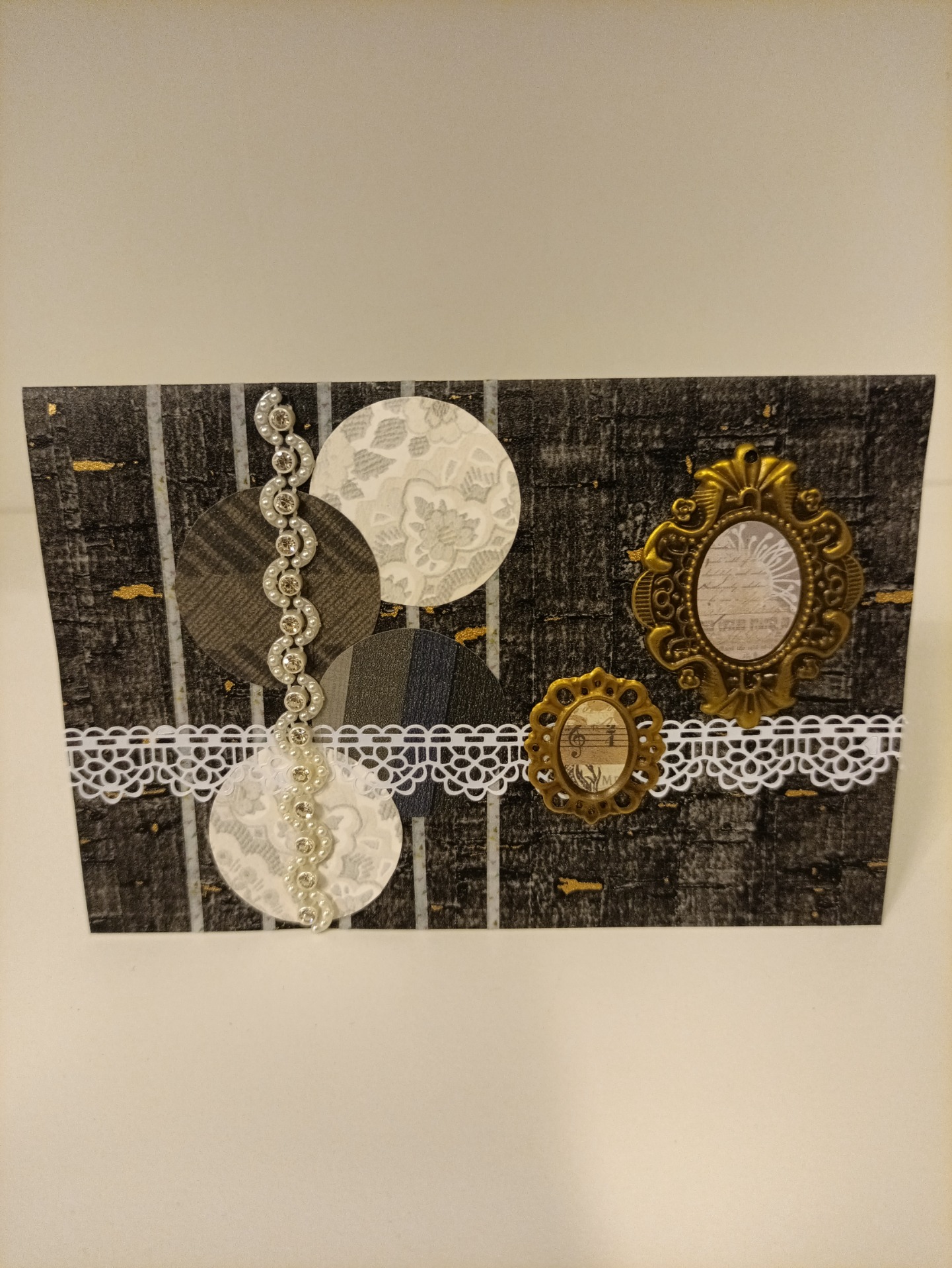 Kort, dobbel, laget av tapet-, scrapbook- og gjenbruksmateriale. 15x10 cm. Konvolutt følger med.