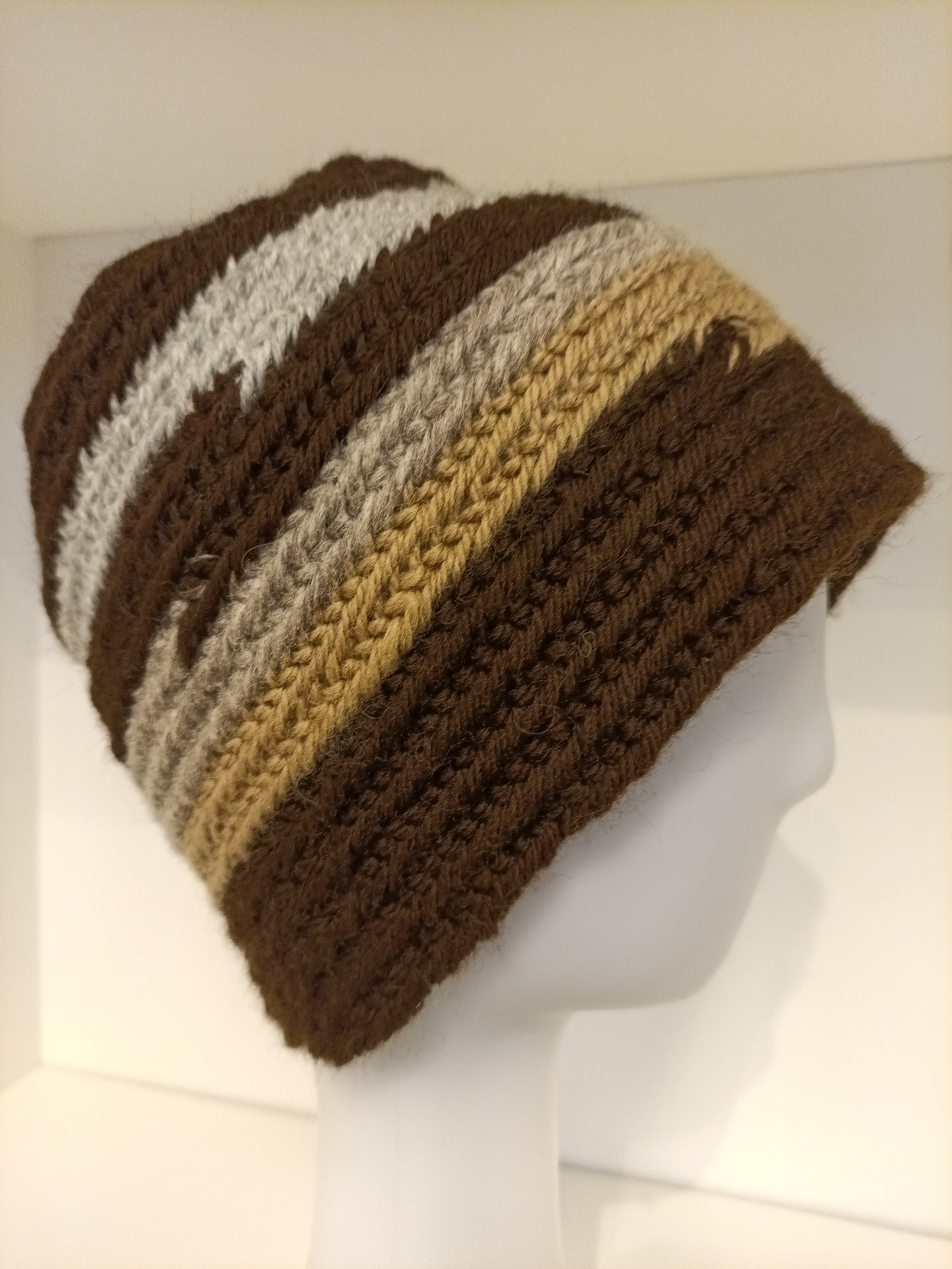 Nålebundet lue i 100% ull, 50 cm omkrets. Nålebinding er en meget gammel teknikk hvor alle maskene er låst, noe som betyr at hvis en skulle få et hull, vil det ikke rakne. Det er diskutert om vikingene brukte denne teknikken, da det er gjort funn før og etter vikingtiden, men ikke noe fra perioden selv. Noen vil mene at dette kan brukes som en detalj til en vikingdrakt, mens andre mener det motsatte.