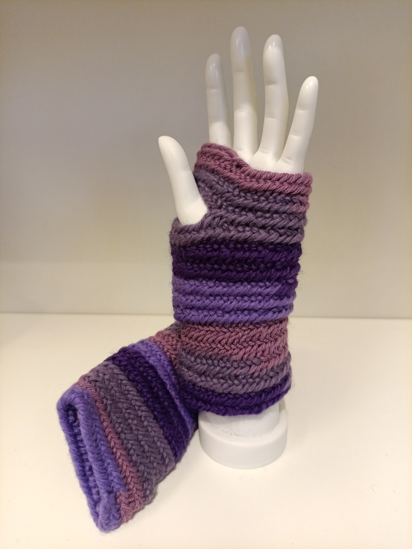 Nålebundet pulsvarmere i 100% ull. Omtrent 20 cm omkrets, 13 cm opptil tommelen, 5 cm etter tommelen. Noe strekkbart. Nålebinding er en meget gammel teknikk hvor alle maskene er låst, noe som betyr at hvis en skulle få et hull, vil det ikke rakne. Det er diskutert om vikingene brukte denne teknikken, da det er gjort funn før og etter vikingtiden, men ikke noe fra perioden selv. Noen vil mene at dette kan brukes som en detalj til en vikingdrakt, mens andre mener det motsatte.