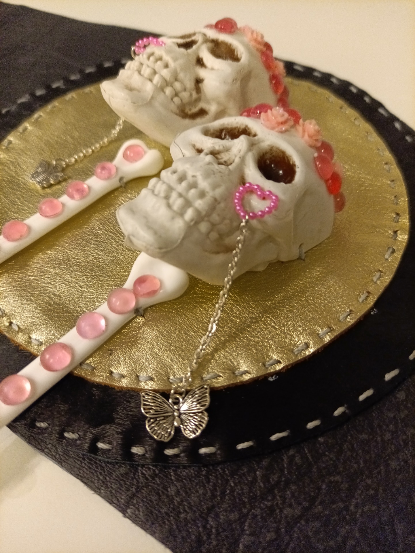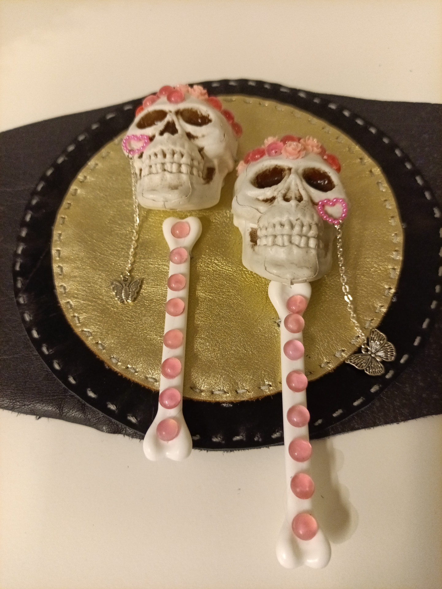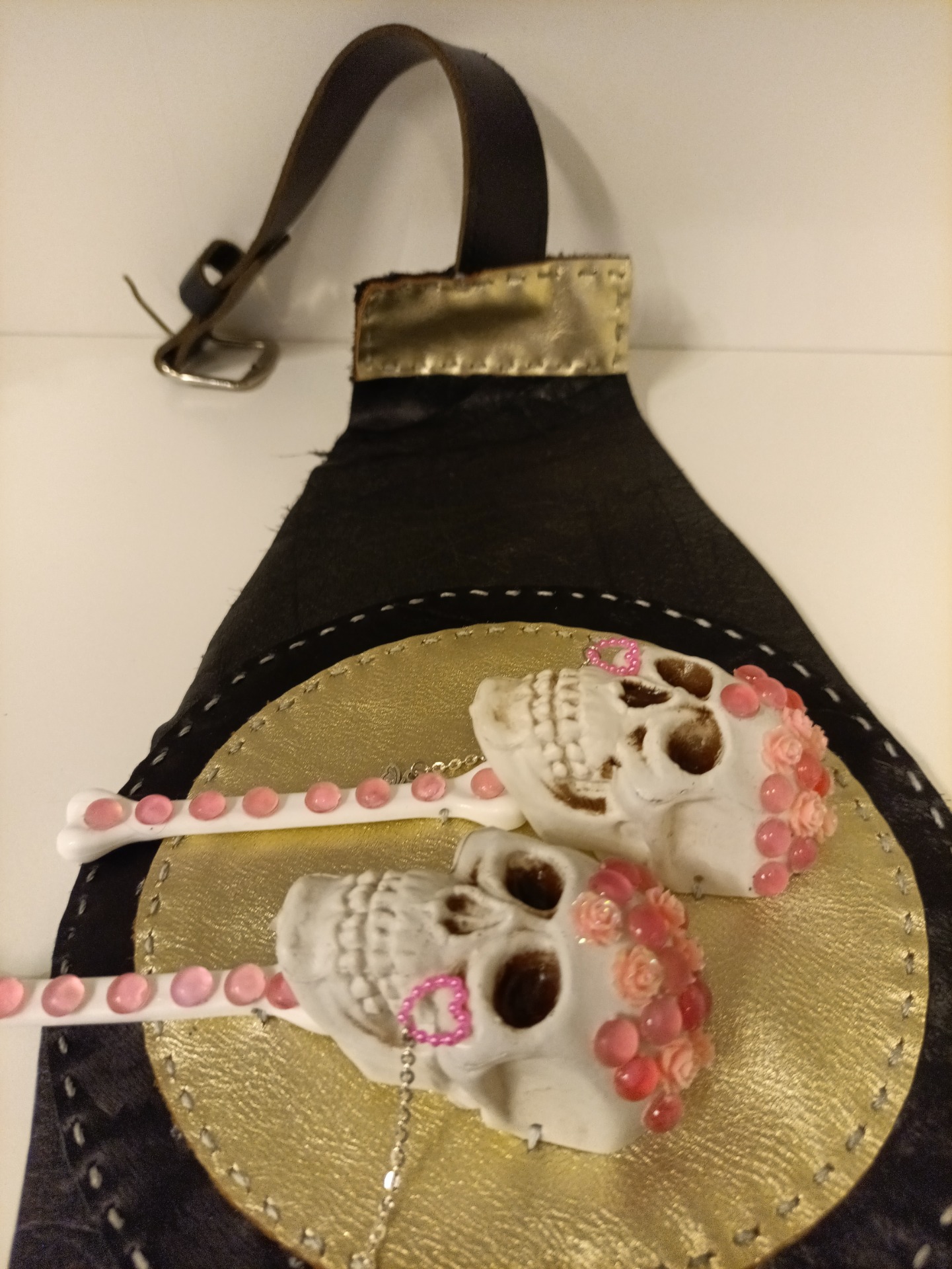 Belte laget i skinn, med detaljer i plast. Noen av materialene er gjenbruksmaterialer. Noen av plastdetaljene er sydd på, noen er limt med kraftig gorilla-lim. 72 cm på det smaleste, 133 cm på det bredeste.